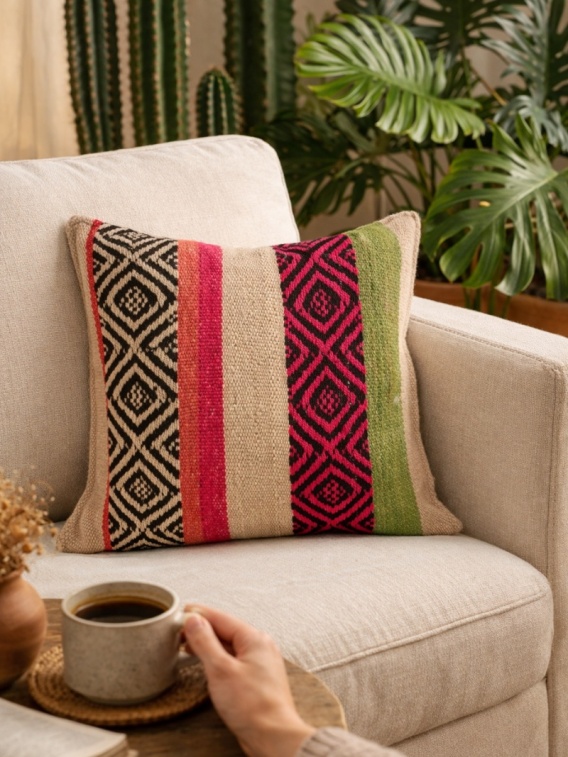 Ta ręcznie tkana poszewka powstała w Peru, z tradycyjnych tkanin tworzonych na ręcznych krosnach. Każdy egzemplarz jest inny, bo powstaje powoli, z uważnością i szacunkiem do rzemiosła. To odpowiedź na zmęczenie masową produkcją i dekoracjami, które nic nie znaczą.